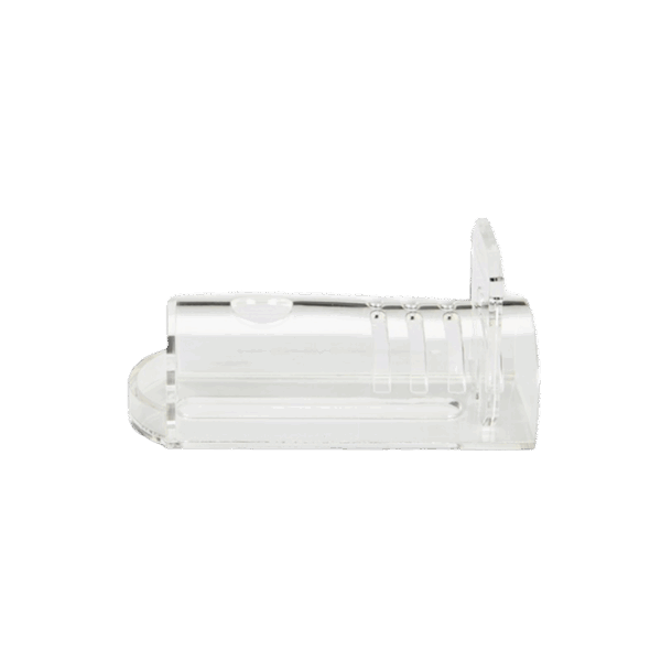 To use, remove the tailgate and position the restrainer so the open end makes a 45° angle with the tabletop. Secure the rodent by the base of the tail and gently guide into the restrainer, forelimbs first. Apply gentle pressure to prevent the rodent from backing out of the restrainer. Once positioned, replace the tailgate into the groove to hold the animal in place.