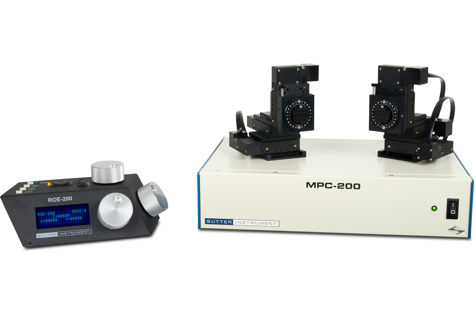 The MPC-325 System from Sutter Instrument delivers the scalable multi-manipulator platform of the MPC-200 controller series at a more accessible price point, using the MP-225 micromanipulator — an economical yet highly capable alternative to the industry-standard MP-285. A single MPC-200 drives 1 or 2 MP-225 units; daisy-chaining two MPC-200 controllers to one ROE-200 enables up to 4 manipulators from a single operator interface.
