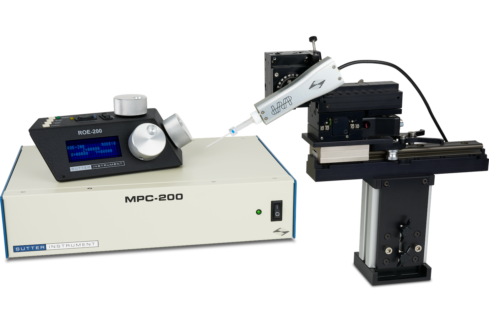 - MPC-365-2 MPC-365-2 System — 2× MP-865 narrow-format micromanipulators, 1× MPC-200 controller, 1× ROE-200, mounting hardware, cables, manual