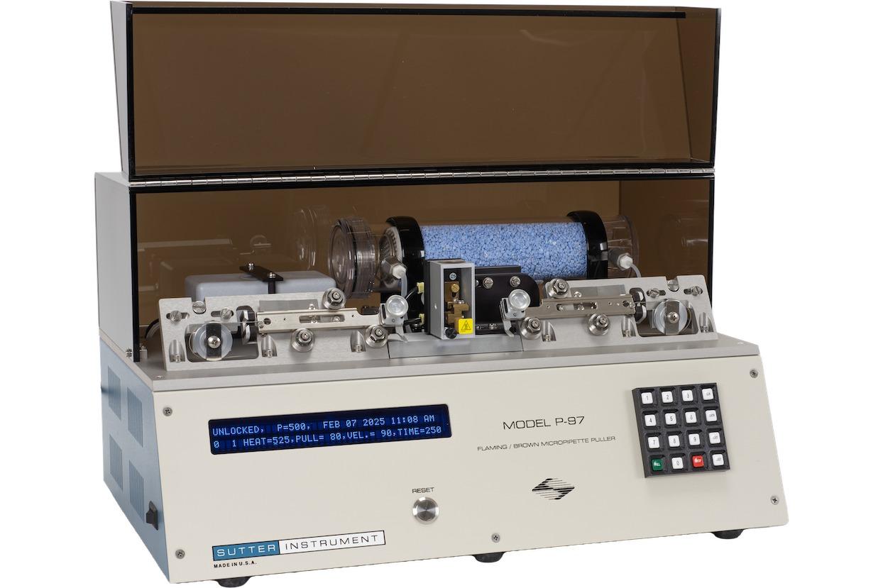 The P-97 is Sutter Instrument's proven Flaming/Brown micropipette puller — a velocity-sensing, programmable puller with humidity-controlled chamber, 100 program storage, and 8-line programming. Pulls all glasses except quartz; tip diameters 0.06–3 µm. Ideal for patch clamp, intracellular recording, and microinjection.